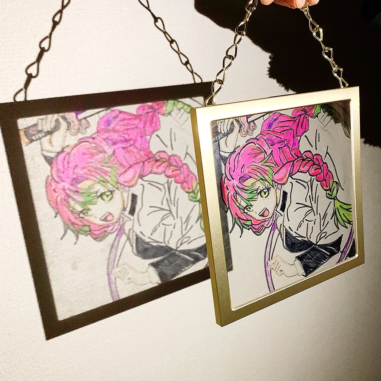 更にこのガラスアートはフォトフレームに直で筆を入れていますので、暗闇でライトを当てると壁に映し出されます。